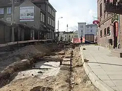 Podczas nadzorów archeologicznych nad pracami ziemnymi prowadzonymi w rejonie narożnika ul. Podwale oraz Krętej zarejestrowano na głębokości 1,2 - 2,0 m relikty średniowiecznej zabudowy drewnianej z ceramiką datowaną na koniec XIV – XV wiek[1].