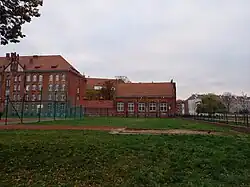 | tereny szkole z zabudową, boiskami i innymi urządzeniami strona południowo-wschodnia za garażami przy odcinku od ulicy Grochowej do ulicy Stalowej[1][4][16][6] (część terenu dawnego Parku przy Kwaśnym Źródle[1][2]) |