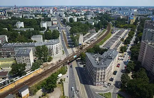 - ↑ Tego samego, który zaprojektował również kompleks handlowy[f] przy położonym nieopodal pl. Hirszfelda.