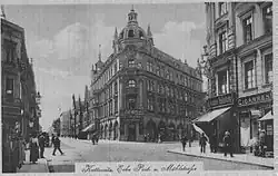 - Kamienica mieszkalno-handlowa (ul. Młyńska 17–19)[24]; wzniesiona w 1911 według projektu Hugo Weissenberga, w stylu modernizmu, z trzema oficynami (dwie boczne oraz jedna tylna). Wcześniej istniała tu kamienica dwukondygnacyjna. Na drugiej i przedostatniej osi tynkowanej dziewięcioosiowej elewacji frontowej umieszczono trójosiowe półokrągłe wykusze. Ozdobny portal zastosowano jako zwieńczenie drzwi wejściowych (znajdujących się na drugiej i siódmej osi). Dwa kolosalne pilastry, zdobione kartuszami, umieszczono na osiach wykuszy. Kolumnowe półokrągłe loggie balkonowe umiejscowiono na czwartej kondygnacji. Nad wykuszami znajdują się facjatki z naczółkiem, posiadającym owalny kartusz. We wnętrzu kamienicy zachowały się murowane schody z poręczami drewnianymi oraz fragmenty dawnych witraży, a na suficie i ścianach – sztukatorskie dekoracje.