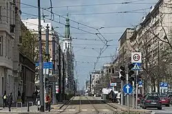 Na całej długości ulicą biegnie również linia tramwajowa.