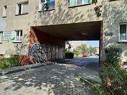 - Wnętrze przy ul. Kruczej (wnętrze z zielenią, ważny dziedziniec, ogród), przy ulicy Bernarda Pretficza[31]