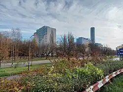 - ↑ Widok między innymi na osiedle Powstańców Śląskich, przez które przebiega ulica Owsiana oraz po prawej stronie zdjęcia osiedle Gajowice. Na środku zdjęcia, za długim czteropiętrowym budynkiem przy ulicy Wincentego Stysia 24-69, widoczny zespół zabudowy obejmujący między innymi budynki przy ulicy Skwierzyńskiej 4-20b. Widoczny jest też niewielki fragment budynku szkoły. Po lewej od wymienionej zabudowy, przed ulicą Zaporoską, widoczne wolnostojące bloki przy ulicy Lubuskiej, Skwierzyńskiej i Zaporoskiej. Za opisaną tu zabudową, a przed nasypem kolejowym przebiega ulica Owsiana.