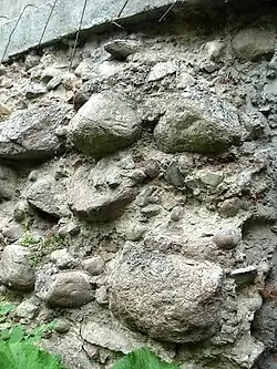 - Fragment przy posesji nr 18-20. Korona muru jest zachowana na poziomie obecnego gruntu.