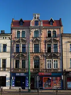 - Kamienica (ul. Warszawska 5)[30], zbudowana w stylu historyzmu (eklektyzmu) z elementami neobarokowymi (1890, proj. Arthur Hausler, w 1891 rozbudowano oficynę tylną według projektu Paula Frantziocha, w 1898 dokonano przebudowy na parterze, a w 1900 nadbudowano oficynę tylną według projektu A. Zimmermanna.