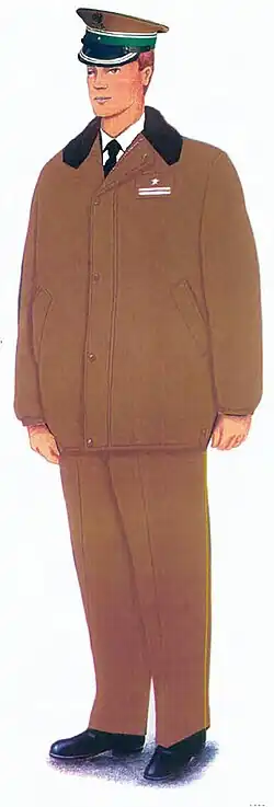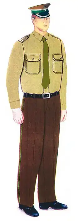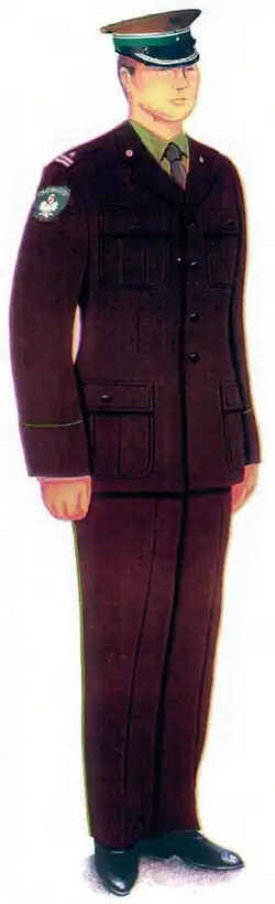 W składzie ubiorów galowego i wyjściowego noszono mundur wyjściowy. Mundur występował w trzech odmianach kolorystycznych: khaki (ubiór wojsk lądowych), granatowy (ubiór marynarki wojennej) i stalowy (ubiór wojsk lotniczych). Od wzorów wojskowych mundur ten odróżniały zielone lamówki wszyte w zewnętrzne boczne szwy spodni oraz rękawów.