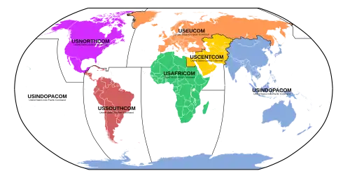- USAFRICOM – Dowództwo Afrykańskie – obejmuje obszar Afryki (bez Egiptu i Rogu Afryki) i okolicznych wód Atlantyku i Oceanu Indyjskiego;