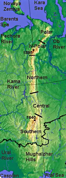 - Ural Polarny – od Zatoki Bajdarackiej do źródeł rzeki Chułgi; bardzo wąski łańcuch o rzeźbie alpejskiej i wysokości do 1472 m n.p.m. (Pajer)[3]