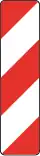 U-9a: tablica ograniczenia skrajni poziomej drogi (lewa) | Tablicę umieszcza się w miejscu, w którym obiekt budowlany (budynki, podpory wiaduktów itp.) znajdujący się w skrajni drogi może być narażony na uszkodzenie przez pojazdy[1]. Stosowana jest również w przypadkach przejścia pobocza bitumicznego w chodnik[2]. | ||||||||||