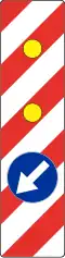 U-3e: tablica prowadząca dwustronna | Umieszcza się jak U-3a i U-3b prawo lub w lewo, jeżeli nagła zmiana kierunku jazdy jest konieczna w dwóch kierunkach jazdy. | ||||||||||