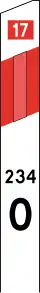 | U-1b: słupek prowadzący umieszczony na barierze ochronnej | Słupek stosuje się w takim samym celu, jak U-1a, różni się od niego konstrukcją i umieszczeniem. Dopuszcza się umieszczanie na nim znaku kilometrowego U-7 oraz hektometrowego U-8, jak na poniższym przykładzie: