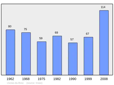 Według danych na rok 1990 gminę zamieszkiwało 57 osób, a gęstość zaludnienia wynosiła 13 osób/km² (wśród 1545 gmin Langwedocji-Roussillon Usclas-du-Bosc plasuje się na 843. miejscu pod względem liczby ludności, natomiast pod względem powierzchni na miejscu 1039.).