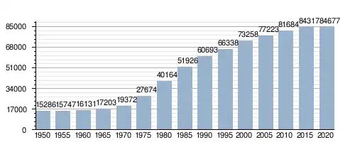 Zmiany w populacji terenu miasta w latach 1950–2020: