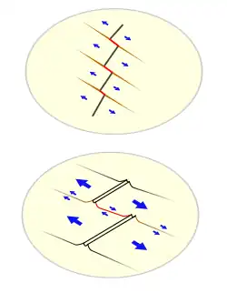Uskok transformacyjny (uskok transformujący) – granica tektoniczna między dwiema płytami litosfery, które przemieszczają się poziomo i równolegle względem siebie. Na ilustracji aktywne uskoki (zaznaczone na czerwono) łączą części strefy spreadingu położonej na grzbiecie oceanicznym. Na odcinku pomiędzy częściami obie płyty poruszają się w przeciwnych kierunkach (lecz inaczej niż przy uskokach przesuwczych), co wywołuje wiele płytkich trzęsień ziemi. Na przedłużeniu aktywnego uskoku oba fragmenty płyty przemieszczają się zgodnie w poziomie (może wystąpić niewielki ruch w pionie), a pęknięcie utworzone przez uskok transformujący „zabliźnia się”. Ślad uskoku transformującego w obrębie płyty może być widoczny na setki, a nawet tysiące kilometrów od grzbietu śródoceanicznego, tworząc oceaniczną strefę spękań (od ang. fracture zone).