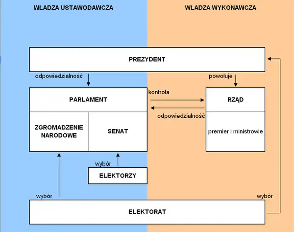 W swym założeniu konstytucja utrzymuje dwuczłonową egzekutywę. Szef rządu otrzymał inną nazwę niż w IV Republice, zamiast prezesa rady ministrów – premier. Głową państwa jest prezydent Republiki. To on, a nie premier, przewodniczy posiedzeniom rządu. Prezydent, jako arbiter, posiadający pewne uprawnienia osobiste został usytuowany ponad partiami politycznymi. Charles de Gaulle sam przekonywał, że zapewni to normalne funkcjonowanie władz. Dlatego też ustrój V Republiki zyskał nazwę „semiprezydencki”.