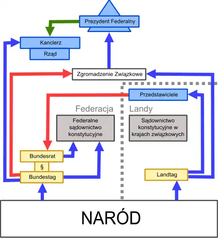 Każdy kraj związkowy posiada swój własny rząd i parlament (zwany landtagiem), które posiadają szerokie kompetencje w tworzeniu prawa i sprawowaniu władzy wykonawczej. Na szczeblu federalnym praktycznie cała władza wykonawcza należy do kanclerza – głowy rządu federalnego, który jest wybierany przez niższą izbę parlamentu, czyli Bundestag. Większość władzy prawodawczej należy do niższej izby parlamentu – Bundestagu, która jest wybierana w wyborach mieszanych, proporcjonalno-większościowych z 5-procentową klauzulą zaporową. Wyższa izba parlamentu Bundesrat składa się z delegatów rządów krajowych i pełni głównie rolę kontrolną.