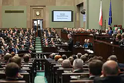 Sejm liczy 460 posłów wybieranych w wyborach powszechnych, równych, bezpośrednich i proporcjonalnych, w głosowaniu tajnym[48]. Sejm zajmuje ważną pozycję w zakresie sprawowania funkcji ustrojodawczej, czego wyrazem jest jego pozycja w procesie zmiany konstytucji[33]. Ponadto przypisane mu są funkcje następujące: