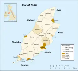 System samorządu lokalnego na Wyspie Man oparty jest na instytucjach, których tradycja sięga czasów średniowiecza. Występuje dwustopniowy podział administracyjny: istnieje sześć okręgów (sheadings), które dzielą się jeszcze na parafie (łącznie 21) i miasta (łącznie 3).