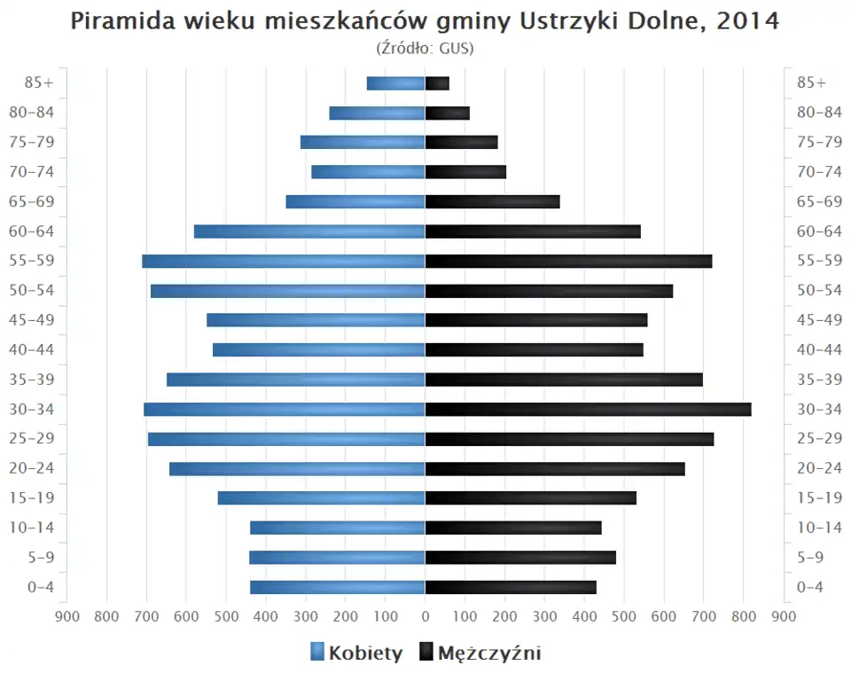 - Piramida wieku mieszkańców gminy Ustrzyki Dolne w 2014 roku[1].