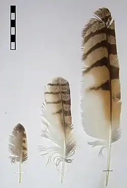 Młode wyglądają podobnie, jednak kreskowanie jest delikatniejsze, „uszy” z piór krótsze i mniej widoczne, a szlara ciemniejsza.