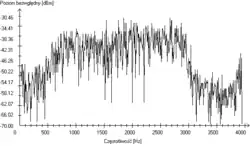 Widmo sygnału modemu pracującego według zalecenia V.27ter z prędkością 4800 bit/s na typowej linii telefonicznej o szerokości pasma przepustowego równego 4 kHz.
