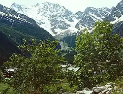 ![]() Widok z lodowca Ghiacciaio del Belvedere na dolinę Valle Anzasca | |