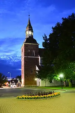Centrum miasta z kościołem św. Szymona i muralem z XVII-wiecznym planem miasta | |||||