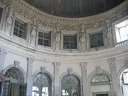 Dekoracja pomieszczeń jest bogata, łącząca malarstwo, rzeźbę i elementy architektoniczne. Westybul zdobiony jest dwunastoma kolumnami doryckimi i marmurowymi rzeźbami. Owalny salon zwieńczony kopułą ma ściany w dolnej kondygnacji przeprute oknami i otworami wejściowymi, między które wstawione są pilastry korynckie, wspierające belkowanie. Ponad nim hermy i atlanci dźwigają kosze, na których opiera się drugie belkowanie. Pokoje usytuowane po bokach salonu mają ściany wykładane boazerią i malowane plafony zdobione stiukami i złoconymi rzeźbami.
