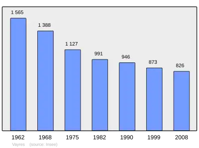 Według danych na rok 1990 gminę zamieszkiwało 946 osób, a gęstość zaludnienia wynosiła 25 osób/km² (wśród 747 gmin Limousin Vayres plasuje się na 137. miejscu pod względem liczby ludności, natomiast pod względem powierzchni na miejscu 95.).