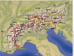 Najdłuższy, oznaczony kolorem czerwonym szlak podzielony jest na 161 jednodniowych etapów i przebiega z Triestu we Włoszech do Monako. Ponadto wytyczono również szlak niebieski (61 etapów), zielony (13 etapów), żółty (40 etapów) i fioletowy (66 etapów). Łączna długość wytyczonych tras przekracza 5000 km.