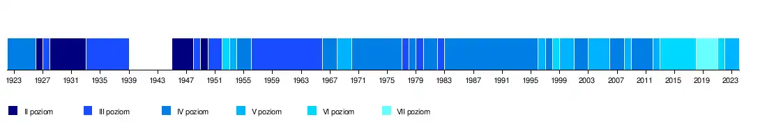 | Sezon | Poziom | Rozgrywki | Miejsce | Mecze | Punkty | Zwycięstwa | Remisy | Porażki | Bilans bramkowy | Uwagi | Puchar Polski (rozgrywki centralne) | |