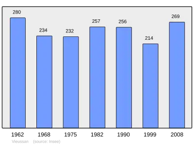 Według danych na rok 1990 gminę zamieszkiwało 256 osób, a gęstość zaludnienia wynosiła 9 osób/km² (wśród 1545 gmin Langwedocji-Roussillon Vieussan plasuje się na 660. miejscu pod względem liczby ludności, natomiast pod względem powierzchni na miejscu 216.).