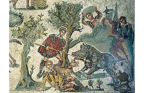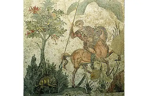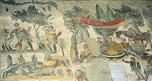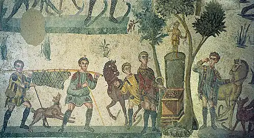 Mozaika opowiadająca w sposób naturalistyczny o polowaniu w lasach należących do latyfundium. Składa się ona z pięciu obrazków: