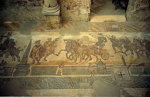 Mozaika w pomieszczeniu zwanym „palestra”, służącym do ćwiczeń przed lub po gorącej kąpieli. Przedstawia wyścigi kwadryg w Circus Maximus w Rzymie. Doskonale zachowana mozaika z przedstawionymi wiernie realiami wyścigów i precyzyjnie oddająca wygląd Circus Maximus jednoznacznie łączy willę z elitą rzymską, która regularnie odwiedzała wyścigi i je finansowała – zamawiający mozaikę musiał być bywalcem tych wyścigów.