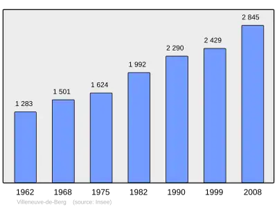 Według danych na rok 1990 gminę zamieszkiwało 2290 osób, a gęstość zaludnienia wynosiła 93 osób/km² (wśród 2880 gmin regionu Rodan-Alpy Villeneuve-de-Berg plasuje się na 386. miejscu pod względem liczby ludności, natomiast pod względem powierzchni na miejscu 339.).