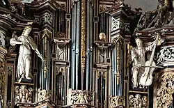 Fragment prospektu organów kamieńskich z figurami aniołów grającymi na viola da braccio (po lewej) i viola da gamba (po prawej)[1]