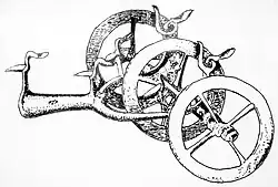 Wózek pochodzi z okresu halsztackiego. Datuje się go na X–VIII wiek p.n.e. Stanowi dowód na wysoki poziom metalurgii tych ziem w czasie, kiedy został wykonany. Obiekt składa się z trzech, połączonych osią kół – każde ma cztery szprychy. Zawiera widlasty dyszel z tulejką[2]. Oś i dyszel zdobią wizerunki sześciu ptaków – możliwe, że są to łabędzie (zwierzęta te swoją formą i usytuowaniem nawiązują do podobnie zdobionych fibul z Miodnicy i Kolska). Istnieje możliwość przymocowania trzonka i ciągnięcia (pchania) wózka za jego pomocą[2]. Przez archeologów z czasów znalezienia przedmiotu został on określony mianem „wózka kultowego” i pod tą nazwą był potem znany. Badacze ówcześni zakładali, że był to wózek boga Odyna ciągnięty przez dwa kruki: Hugina i Mogina (Munina). Inni zakładali, że przedmiot był zabawką dla dzieci wysoko postawionego dostojnika z tych ziem. Inne teorie wskazywały, że mógł to być element zastawy stołowej, parament obrzędów solarnych, miniatura pojazdu boga deszczu lub ziemi, narzędzie do wyjmowania czegoś z pieca, a nawet rodzaj krajalnika do ciast[1].