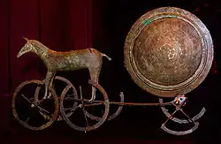 Tworzyło go sześciokołowe podwozie o długości 60 centymetrów, na którym z przodu była zamontowana figurka konia, z tyłu zaś pokryta złotą folią brązowa tarcza o wadze 1,55 kilograma. Została ona wykonana z dwóch zespojonych ze sobą wypukłych krążków, wykonanych techniką odlewu. Powierzchnia tarczy jest bogato zdobiona ornamentem złożonym z motywów geometrycznych (koncentryczne kręgi, spirale). Pod szyją konia znajduje się niewielkie uszko, które być może służyło do połączenia za pomocą rzemienia bądź sznurka, z uszkiem na krawędzi krążka. Interesujący jest przy tym fakt, że figurka konia także jest osadzona na podwoziu.