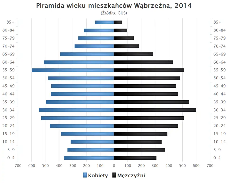 Piramida wieku mieszkańców Wąbrzeźna w 2014 roku[12].