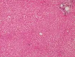 W wątrobie można wyróżnić łącznotkankowy zrąb oraz miąższ, które tworzą podstawowe jednostki strukturalno-czynnościowe wątroby (hepatocyty)[3]. Układają się one w blaszki (płytki, beleczki) wątrobowe, oplecione naczyniami krwionośnymi i przewodami żółciowymi śródpłacikowymi. Beleczki odchodzą promieniście od żyły centralnej.