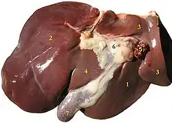 - lewy – ograniczony na powierzchni przeponowej przez przyczep więzadła sierpowatego, u przeżuwaczy dzieli się na płat lewy boczny i lewy przyśrodkowy; u konia wcięcie międzypłatowe jest stosunkowo płytkie[2];