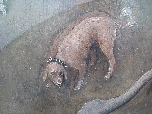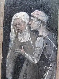 Rotterdamskie tondo w wielu miejscach przypomina przedstawienie wędrowca tworzące rewersy skrzydeł tryptyku Wóz z sianem, namalowanego w latach 1500–1502. Wspólną cechą obu dzieł jest główny bohater o zbliżonym ujęciu i upozowaniu, oraz bogate treści oscylujące wokół tematu zagrożenia ludzkiej duszy. Do tej treści nawiązuje groźnie spoglądający i warczący na pielgrzyma pies; szczekanie psa symbolizowało złośliwą obmowę, która rysuje się w rozmowie pary stojącej za oknem gospody. Sama gospoda w oczach Boscha nie tylko jest zobrazowaniem grzechu, lecz także symbolizuje życie doczesne, jego kres poświadczają liczne zniszczenia budynku. Odczucie, iż gospoda ma charakter dość podejrzany podkreśla fakt zachowania jej gospodarzy, prócz obmawiających, w zachowaniu stojącej przy drzwiach pary emanuje bezwstyd, która w sposób ostentacyjny okazuje wzajemne, cielesne pożądanie. Seksualne znaczenie posiadają również niektóre przedmioty, według części badaczy takie treści zawierają kij, drewniana chochla, sztylet, szydło, natomiast gołębnik na strychu i klatka z ptakiem interpretowane były jako znaki nieładu moralnego.