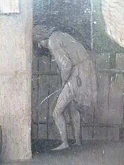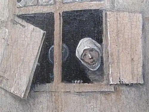 Na tondzie został ukazany wędrujący mężczyzna, w starszym wieku. Starość poświadczają liczne zmarszczki na twarzy i widoczne zza chusty siwe włosy. Mężczyzna wykonuje gest pozdrowienia, zwracając się lekko za siebie, w stronę miejsca niewidocznego na obrazie. Spośród ukazanych ludzi zgromadzonych na terenie starej gospody, wieśniacza para wyłaniająca się zza okna obserwuje wędrowca, zaś stojąca przy drzwiach kolejna para spogląda na prawo, w stronę niewidocznego na obrazie punktu. Jednocześnie mężczyzna w sposób lubieżny przekonuje kobietę. Pod domem, przy pobliskim drewnianym płocie, widoczny jest także ubogi włóczęga załatwiający swoje potrzeby fizjologiczne. Główny bohater obrazu jest ubogim i wynędzniałym wędrowcem. Ubrany jest w podniszczone odzienie; widoczną fragmentarycznie białą koszulę i szary strój pielgrzymi; chustę, długi płaszcz i potargane, obcisłe spodnie. Na nogach ma czarne buty, ale każdy z nich ma inny fason. Na lewej nodze, poniżej kolana, wędrowiec ma opatrzoną ranę. W lewej ręce trzyma kapelusz, do którego jest wbite szydło, w prawej drewnianą laskę. Na plecach nosi wiklinowy kosz z żywnością, zaś do pasa ma przywiązaną sakiewkę i sztylet w skórzanej pochwie. Scenerię obrazu tworzy fragment wsi z rozległym krajobrazem. Zabudowę tworzy wspomniana podniszczona gospoda (uszkodzone okiennice oraz fragmenty dachu) o konstrukcji szkieletowej, nakryta słomianym dwuspadowym dachem, którego połacie mają odmienne rozmiary. Do szczytu elewacji przywiązana jest miotła, na okapie dachu wisi klatka z ptakiem, zaś przy bocznej ścianie zwisa mała flaga z łabędziem. Ponadto widoczne jest pudło i drewniana beczka oparta o ścianę budynku. Mieszkańcy gospody noszą charakterystyczne dla późnego średniowieczna stroje domowe. Po prawej stronie domu widoczna jest fragmentarycznie zagroda. Przed domem rozległe podwórze z wysokim drzewem, krzewami i płotem okalającym małe pastwisko z wołem. Przed gospodą maciora i sześć prosiąt spożywające jadło w korycie, obok dwa ptaki i pies w kolczastej obroży warczący na wędrowca. Faunę dopełniają dzięcioł i puszczyk siedzące na gałęziach korony drzewa. Dopełnieniem kompozycji jest rozległy krajobraz, który tworzą pola uprawne, piaszczyste wydmy i pojedyncze drzewa. Obraz charakteryzuje się głębią przestrzeni, wieloplanowością oraz monochromatycznym kolorytem oscylującym wokół szarości i stonowanych żółci, ugrów, umbr i barw piasku.