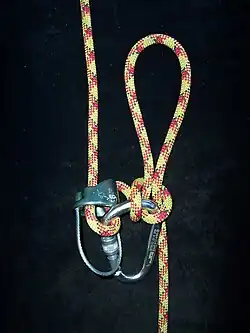 Aby zabezpieczyć węzeł flagowy przed przypadkowym rozwiązaniem, należy zawiązać pętlą węzeł zwykły na linie, która będzie obciążana, lub spiąć pętle z liną przy użyciu karabinka.