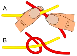 - I faza - złożenie wiązanych nitek (A) i utworzenie pętli (B). Prawą ręką wykonuje się pętlę przekładając nitkę między końcami skrzyżowanych nitek trzymanych między palcem wskazującym i kciukiem lewej ręki.