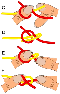 - II faza - przełożenie końca nitki przez pętlę (C, D) i zaciągnięcie węzła (E, F). Prawą ręką (kciukiem) zagina się koniec nitki wsuwając go pod utworzoną pętlę i przytrzymuje kciukiem lewej ręki. Następnie zaciąga się węzeł pociągając nitkę prawą ręką, jednocześnie wysuwając lewy kciuk z pętli. Pętla odwraca się i zaciska węzeł.