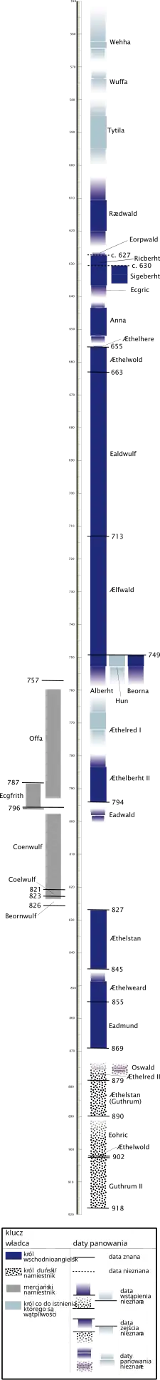 | ok. 627–ok. 629 | Ricberht | RICBRYHT REX ANGLORUM ORIENTALIUM | nie jest pewne czy rządził |