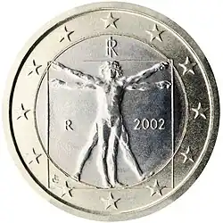 - 1 euro przedstawia Człowieka witruwiańskiego, najsłynniejszą grafikę Leonarda da Vinci, na której przedstawił idealne proporcje ludzkiego ciała.