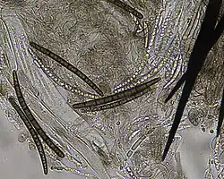 Worki cylindryczne, nieco węższe na wierzchołku, 8-zarodnikowe, amyloidalne, 176–228 × 13,4–16,5 µm. Askospory wrzecionowate, cylindryczne, głównie z 7 septami (u nielicznych występuje 8–9 sept), 106–144,2 × 4,8–6,2 µm; Q = 18,4, Qe = 22,9. Parafizy septowane, niektóre bardzo zakrzywione i zwykle nieco pogrubione na wierzchołku o średnicy 4,3–9,3 µm. Włoski na trzonku czarne, ze spiczastymi wierzchołkami i częściowo zakrzywione u nasady, 91,5–126,4 × 6,4–8,6 μm. Ekscypulum o teksturze intricata[4].