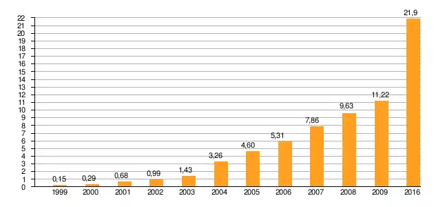 Wykres zmiany nakładów inwestycyjnych w Wałbrzyskiej Specjalnej Strefie Ekonomicznej „Invest-Park” w latach 1997–2016 (w mld złotych)
